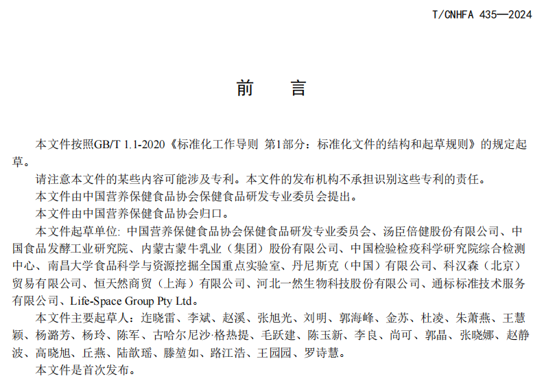 本次发布的《益生菌剂胃液耐受性检验方法》团体标准由肠道健康标准化研究联盟发起,中国营养保健食品协会保健食品研发专业委员会、汤臣倍健股份有限公司、中国食品发酵工业研究院、内蒙古蒙牛乳业(集团)股份有限公司、中国检验检疫科学研究院综合检测中心、南昌大学食品科学与资源挖掘全国重点实验室、丹尼斯克(中国)有限公司、科汉森(北京)贸易有限公司、恒天然商贸(上海)有限公司、河北6163银河生物科技股份有限公司、通标标准技术服务有限公司、Life-Space Group Pty Ltd等权威机构与企业共同完成,标准发布之后,工作组将继续推动本标准在菌株筛选和产品质量评价中的使用。